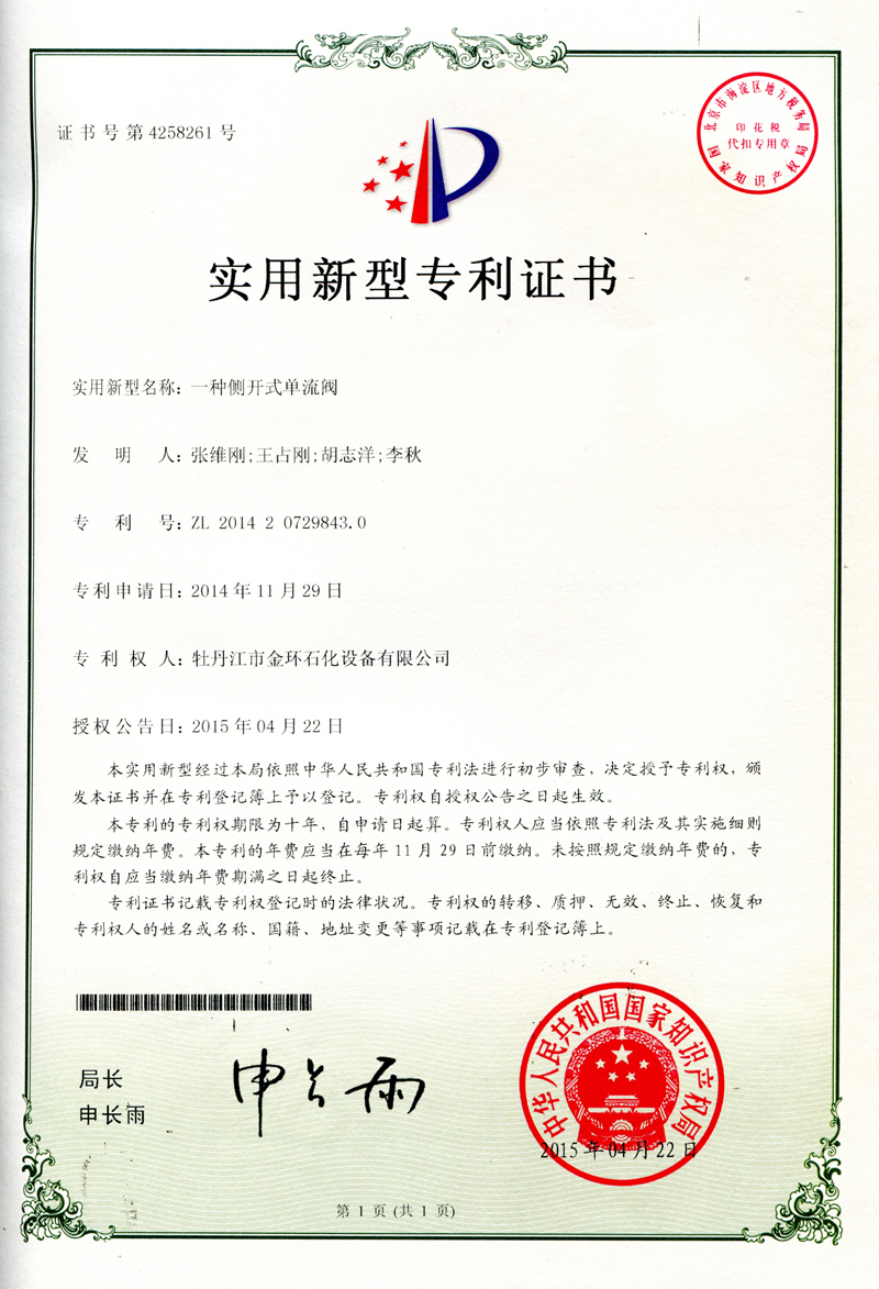 一種側(cè)開(kāi)式單流閥實(shí)用新型專利證書(shū)ZL 2014 2 0729843.0